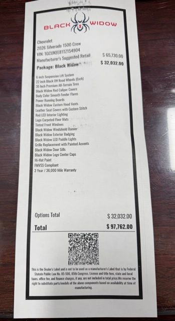 This rare 2026 Chevrolet Silverado 1500 Crew Cab Black Widow Lifted Edition delivers the perfect blend of aggressive styling, diesel efficiency, and serious truck capability. Professionally upfitted by SCA Performance, this Black Widow stands far apart from a standard Silverado and is built for drivers who want standout looks without sacrificing real world performance