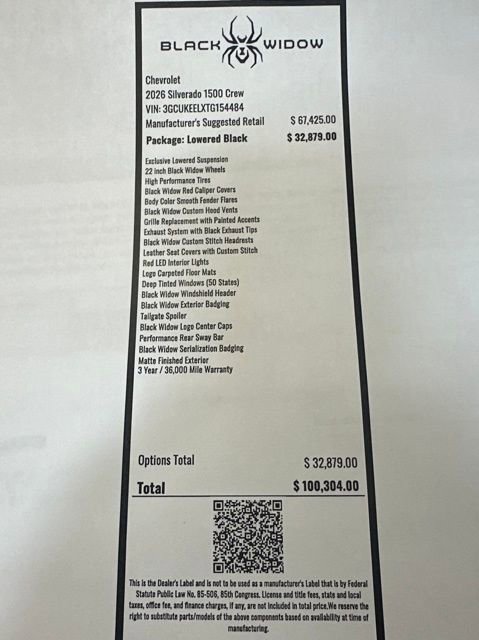 This rare 2026 Chevrolet Silverado 1500 Crew Cab Black Widow Lowered Edition is a head turning performance truck that combines bold styling with serious power and advanced technology. Professionally upfitted by SCA Performance, this Black Widow stands apart from standard Silverados and is built for buyers who want exclusivity without sacrificing capability